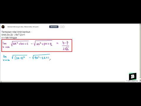 Cara cepat dan mudah mencari nilai limit di tak hingga berbentuk akar dikurangi akar ada tiga kondisi. Dari grafik diketahui bahwa nilai limit kiri dan limit kanan tidak sama untuk x mendekati 2, sehingga sesuai definisi, limit f(x) untuk x mendekati 2 adalah jaditernyata ketika x mendekati tak hingga, nilai y mendekati min tak hingga. Untuk limit tak hingga fungsi trigonometri akan kita bahas pada artikel lain secara khusus dan lebih mendalam. Keempat mengenai nilai limit tak hingga yang berbentuk polinomial dan yang akan di bahas ialah bentuk polinomial dengan variabel x dengan pangkat yang tertinggi. Jika kita memiliki bentuk limit ∞/∞ seperti berikut ini Un sma 2017 matematika ipa pembahasan no 20 limit tak hingga. Cara untuk mendapatkan nilai limit tak hingga dalam bentuk pecahan bisa diperoleh dari menyederhanakan bentuk pecahan itu sendiri. Selanjutnya, pada kesempatan kali ini akan dipelajari mengenai limit tak hingga fungsi satu peubah. Dan jika di gambarkan ke dalam diagram kartesius maka akan berbentuk garis yang lurus. Dari tabel terlihat bahwa untuk $ x \, $ mendekati 2, maka hasil fungsinya (nilai $y $ ) semakin besar menuju tak hingga. Sebelum membahas mengenai limit tak hingga, harus dipahami terlebih dahulu makna limit f(x). Jawaban yang benar adalah e. Harapan saya adalah video ini dapat membantu kalian untuk belajar matematika di manapun kalian.